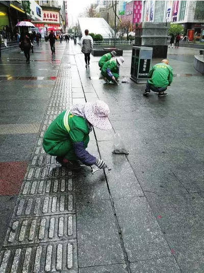 4月6日上午,幾名身著綠色保潔服的城關(guān)物業(yè)保潔員,沿著張掖路步行街一路西行,拿著小鏟子,拎著塑料袋,鏟除地磚上的口香糖。由于口香糖粘黏性強(qiáng),保潔員們有時(shí)候得用雙手才能摳掉。然后將鏟除的口香糖裝進(jìn)攜帶的塑料袋里。3名保潔員自新世界百貨門口行至永昌路時(shí),每個(gè)人手中已經(jīng)拎了少半袋口香糖了。