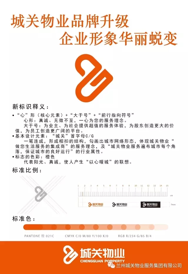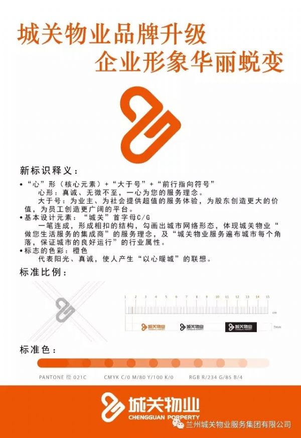 標(biāo)識(shí)是企業(yè)品牌使用頻率最高的視覺符號(hào),是形成品牌視覺形象的核心元素,還是品牌形象的象征與精神體現(xiàn)。城關(guān)物業(yè)服務(wù)集團(tuán)新企業(yè)標(biāo)識(shí)采用了橙色,代表陽(yáng)光、真誠(chéng),使人產(chǎn)生“以心暖城”的聯(lián)想。并將心形、大于號(hào)、前行指向符號(hào)作為核心設(shè)計(jì)元素集于一體。