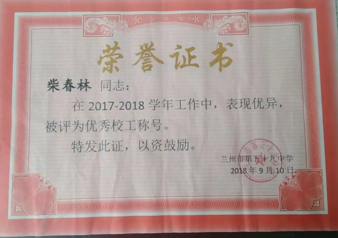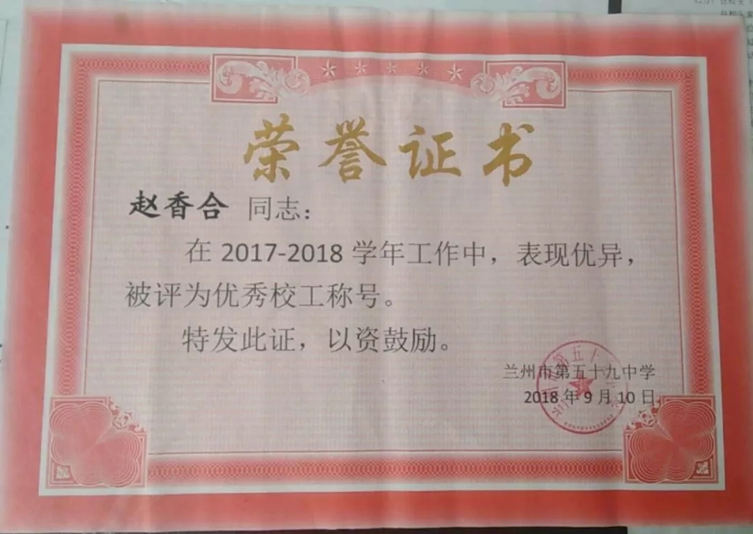 蘭州市第五十九中學(xué)召開(kāi)教師節(jié)表彰大會(huì),會(huì)上城關(guān)物業(yè)員工魏萍、柴春林、趙香合等被評(píng)為“優(yōu)秀校工”。