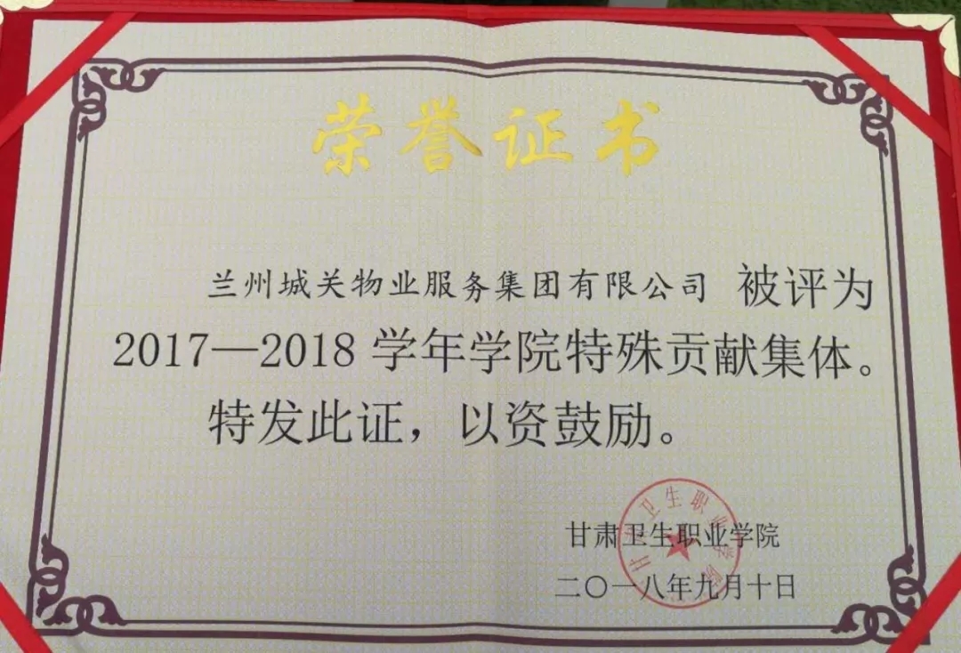 甘肅衛(wèi)生職業(yè)學(xué)院召開(kāi)2018-2019學(xué)年開(kāi)學(xué)典禮暨教師節(jié)表彰大會(huì)。城關(guān)物業(yè)服務(wù)集團(tuán)被評(píng)為2017-2018年學(xué)院特殊貢獻(xiàn)集體獎(jiǎng)。