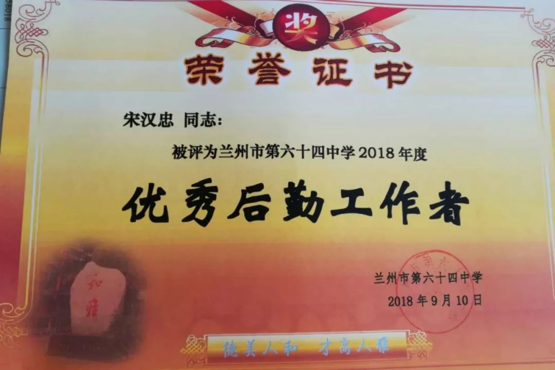 蘭州市第六十四中學(xué)召開(kāi)教師節(jié)表彰大會(huì),城關(guān)物業(yè)員工宋漢忠等被評(píng)為“優(yōu)秀后勤工作者”。