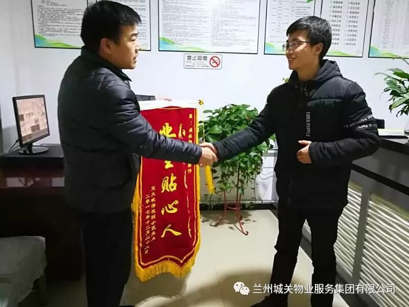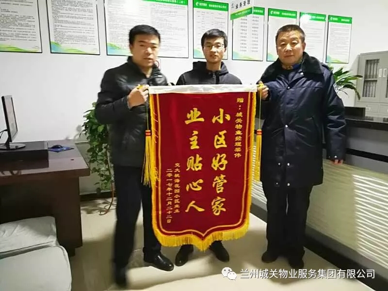 1月14日晚,交大桃;▓@業(yè)委會劉主任代表全體業(yè)主,將一面題有“小區(qū)好管家,業(yè)主貼心人”的錦旗送至項目經(jīng)理梁偉手中,并對城關(guān)物業(yè)的服務(wù)工作給予了高度的評價和肯定。