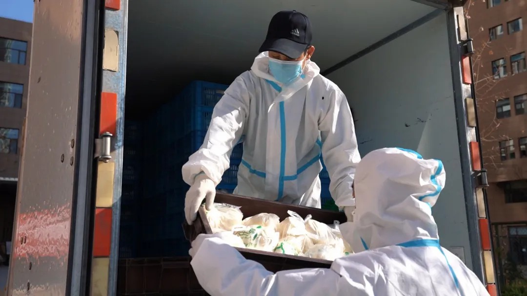 宋師傅是車隊司機之一,他開的是一輛中型貨車,一車能裝兩萬個饅頭,每天從早跑到晚,從東跑到西。“特殊時期,大家都辛苦,也不是我一個人這么拼!”宋師傅黑瘦精干,說話間一車饅頭裝齊又要出發(fā)了。11月10日下午3點左右,宋師傅運送饅頭的車停在安瀾祥園物業(yè)門口,“全副武裝”的物業(yè)工作人員早早等候在那里。大家搬運、分裝、分頭上門派送。每戶10個饅頭,先按5個用塑料袋分裝,再用專門訂制的綠色環(huán)保手提袋裝起來送到業(yè)主手中。