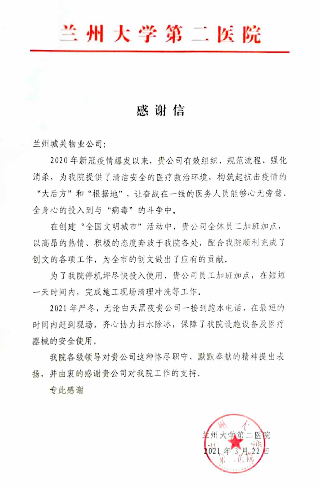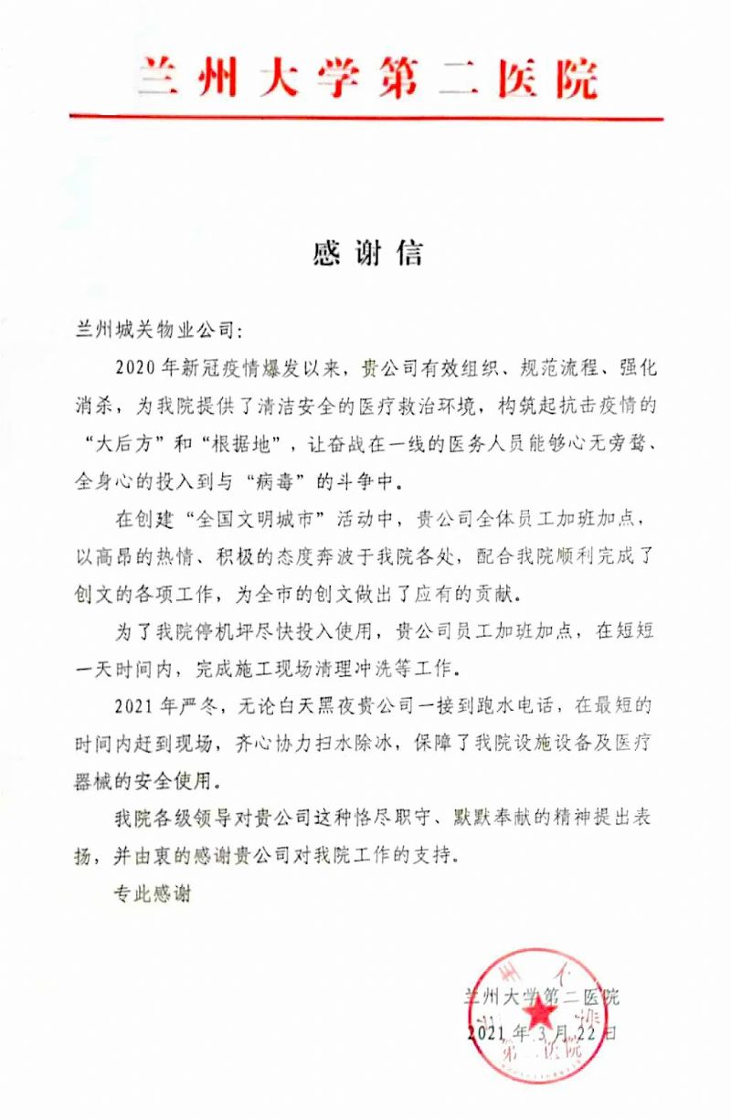 蘭州大學(xué)第二醫(yī)院后勤保障處劉處長一行人專程來到蘭州城關(guān)物業(yè)服務(wù)集團(tuán)有限公司,將一面寫有“物業(yè)好管家 業(yè)主貼心人”的錦旗贈予蘭州城關(guān)物業(yè)服務(wù)集團(tuán)有限公司總裁楊佳林手中,以此表達(dá)對于城關(guān)物業(yè)的感謝和認(rèn)可。劉處長表示,2020年新冠疫情爆發(fā)以來,城關(guān)物業(yè)有效組織,規(guī)范流程,為醫(yī)院提供了清潔、安全的醫(yī)療救治環(huán)境,與醫(yī)院一起構(gòu)筑起抗擊疫情的“根據(jù)地”。城關(guān)物業(yè)加班加點(diǎn)保障醫(yī)院后勤的同時(shí),積極配合醫(yī)院順利完成各項(xiàng)創(chuàng)文工作,為蘭州市創(chuàng)建全國文明城市做出了應(yīng)有的貢獻(xiàn)。